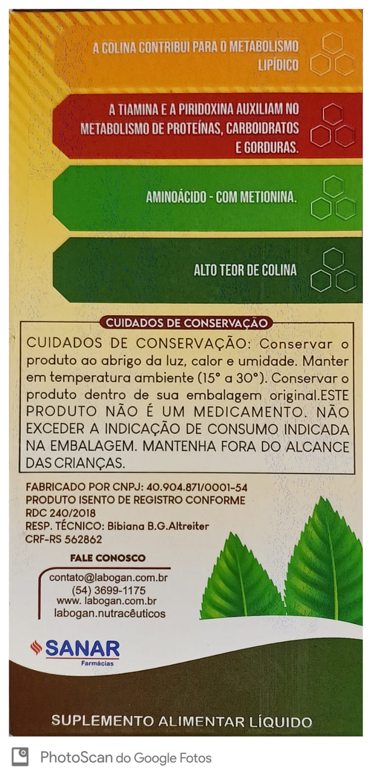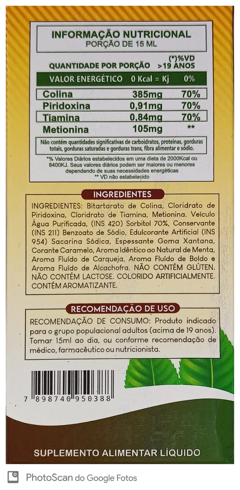 Cada 15ml contém Colina 385mg, Piridoxina 0,91mg, Tiamina 0,84mg e Metioina 105mg